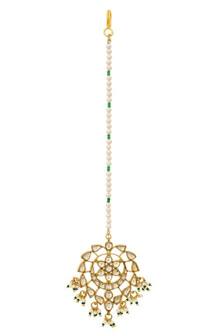 Gold maangtikka featuring a crescent moon-floral motif with pearl string-clusters and green beads