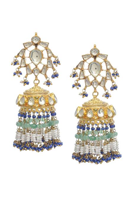 Gold plated jhumkas featuring a floral cutwork pattern with kundan highlights
