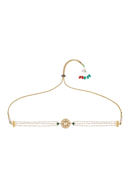 Gold polished choker necklace featuring carved floral design with beads and stone embellishments