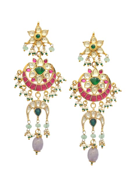 22kt gold plated florin dangler earrings featuring jadau kundan, beads, and pearl embellishments