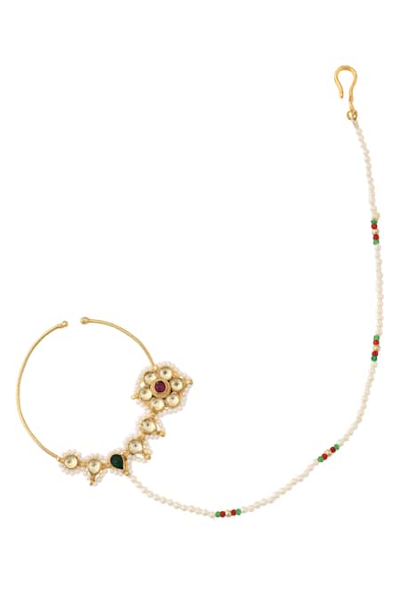 Gold polish nath featuring floral motifs, encrusted with kundan, pink-green stones, and a pearl string