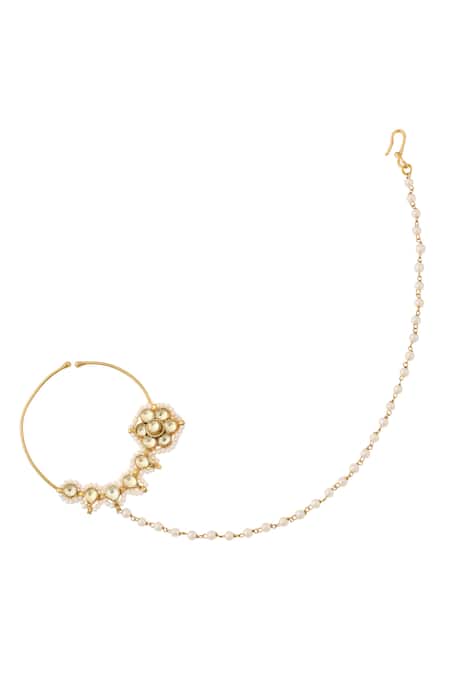 Gold polish nath featuring floral motifs, encrusted with kundan and a pearl rim