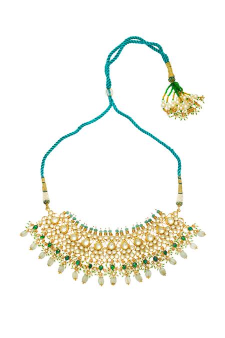 Teardrop shaped jadau kundan embellishments, Green toned stone accents, Intricate bead detailing along the edges