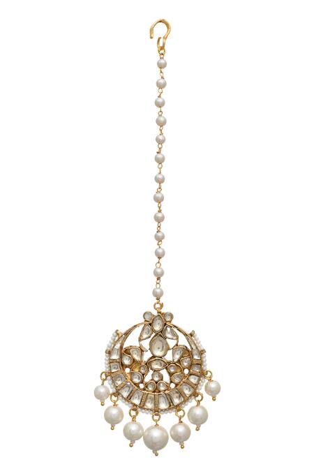 Gold maangtikka featuring intricate kundan embellishments and pearl drops