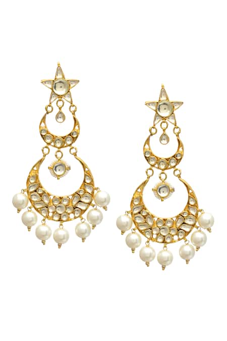 Gold finish layered chandbalis featuring floral and tear drop designs with white kundan and pearl embellishments