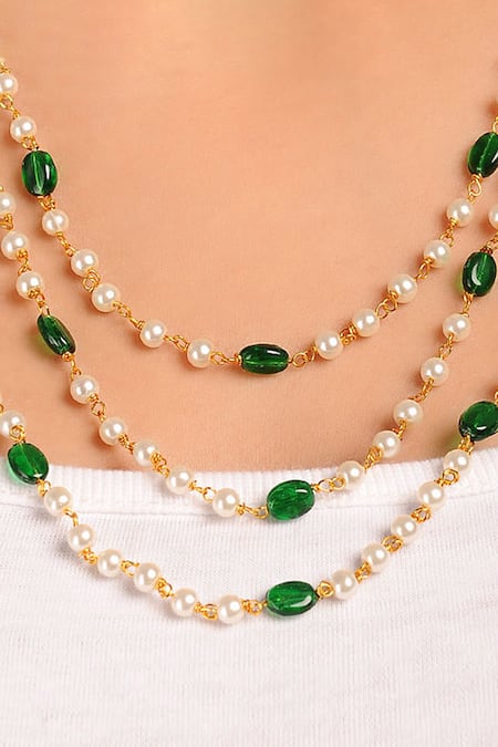 Layered design with alternating green beads and pearls., Fish hook closure for easy wear.