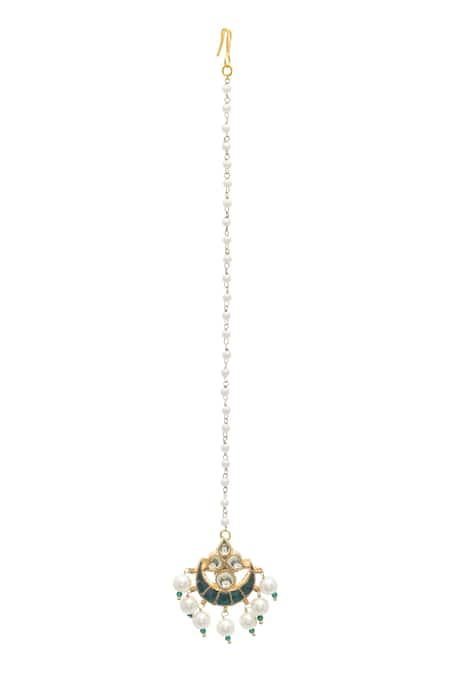 Gold finish maangtikka featuring green pearl and stone embellishments