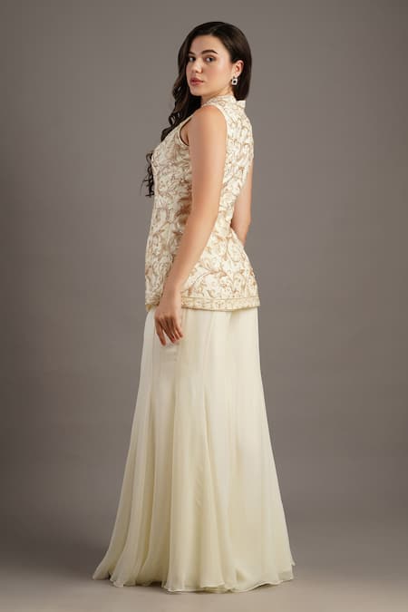 Ivory jacket featuring a band collar and sleeveless design with intricate bahar embroidery. Paired with a flowing sharara for a complete look.