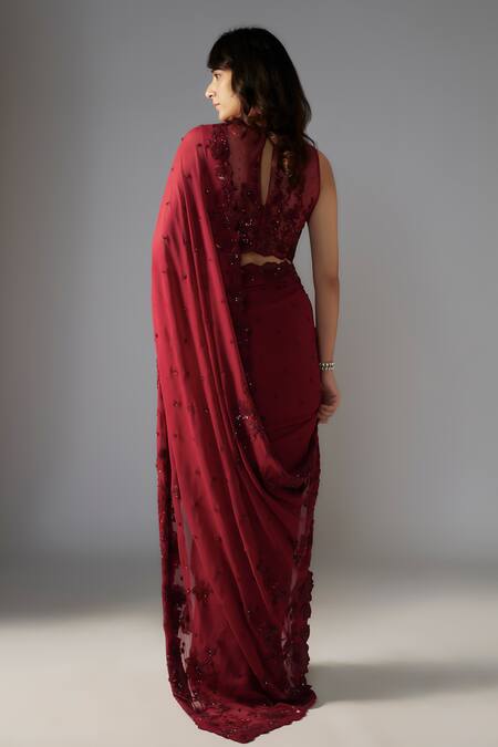 Maroon saree featuring sequin and bead embellished floral jaal patterns. Paired with a padded blouse adorned with sequin bead floral designs and a matching petticoat.