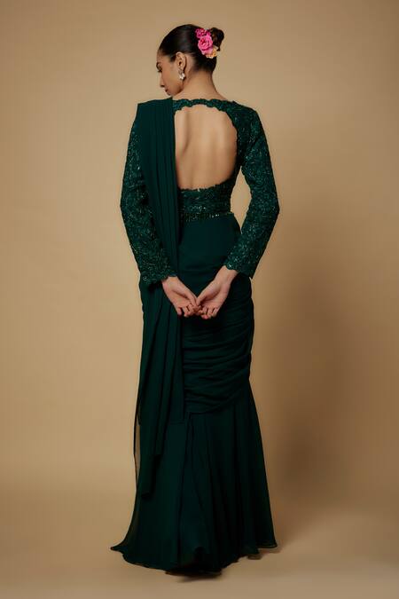 Green georgette pre-draped saree featuring attached lining. Paired with a floral thread and cutdana cutwork embroidered blouse and belt.