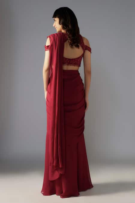 Red pre-draped saree featuring attached lining and a back hook closure blouse. The blouse is off-shoulder with cap sleeves, embellished with sequin and bead geometric patterns.