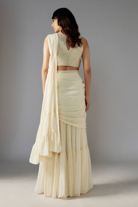 Ivory pre-draped saree featuring tiered design in a georgette fabric. Paired with a padded blouse embellished with sequin and bead scallop patterns.