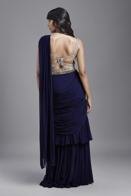 Navy blue pre-draped saree featuring tiered ruffle detailing and an embroidered waist belt. Paired with a wave pattern hand embroidered padded blouse with a back cutout.