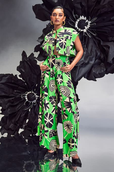 Parrot green cropped vest featuring an abstract geometric print and pockets. Paired with matching cargo pant for a cohesive look.