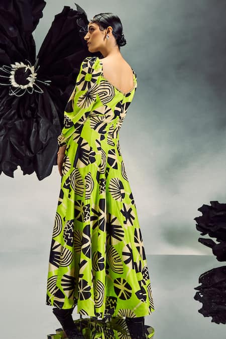 Green Silk Sweetheart Neck Abstract Print Flared Jumpsuit
