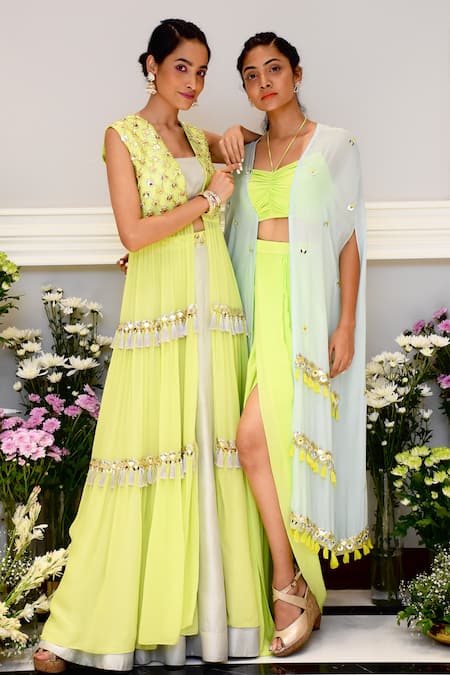 Aqua blue cape with sequin, cutdana embroidered & tassel detail. Paired with neon green crop top & cowl drape skirt.