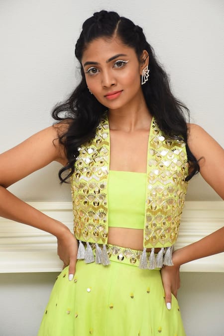 Neon green short jacket sequin, cutdana embroidered & tassel border. Paired with crop top & mirror embroidered flared pant.