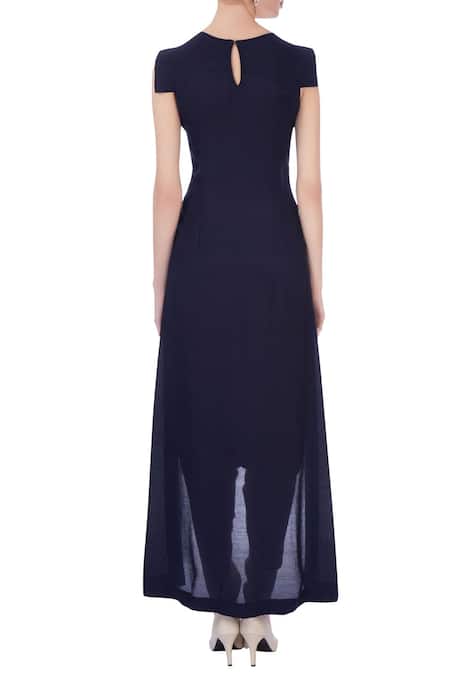 Blue high low tunic with floral motif work. Comes with beige draped pants.