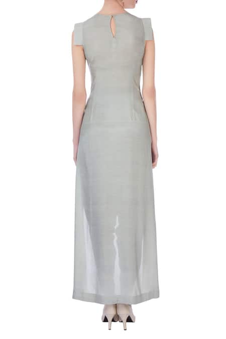 Grey high low tunic with floral motif work. Comes with beige draped pants.