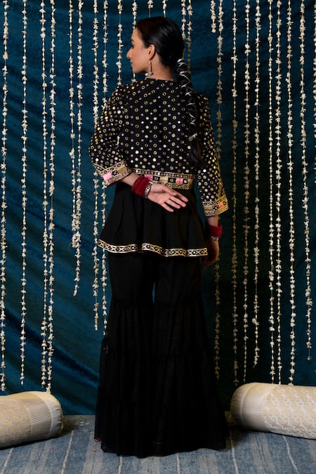 Black peplum jacket featuring round neckline and three-quarter sleeves with mirror hand embroidery. Paired with a flowy layered gharara for a complete look.