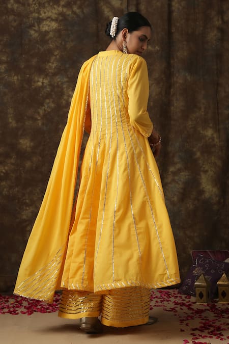 Yellow anarkali with gota work detail. Comes with flared pant and dupatta.