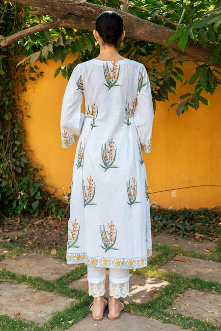 Ivory kurta featuring yellow floral boota hand block print all over. Paired with a lace hem straight pant.