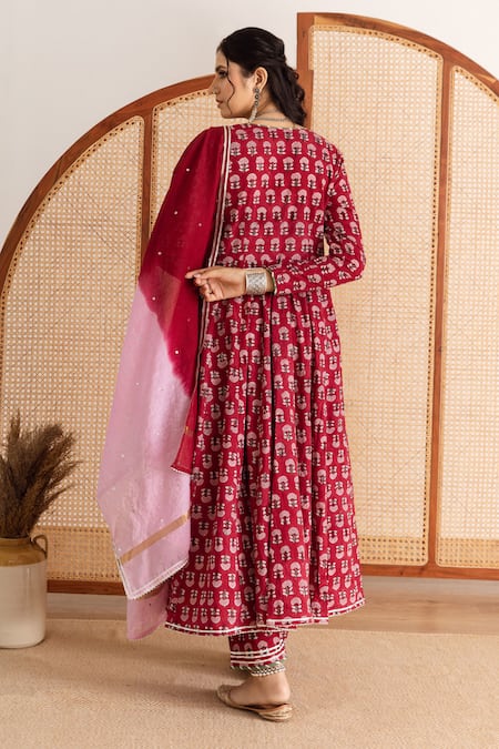 Red block printed Anarkali kurta featuring a pentagon neckline and long sleeves. Paired with matching pant and a Chanderi dupatta.