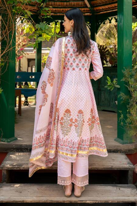 Pink Cotton, Muslin, Chiffon Gota Patti, Lace Mughal Gul Print Anarkali Set