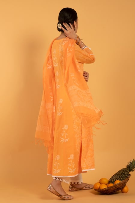 Orange Cotton Embroidery Round Printed Anarkali Set