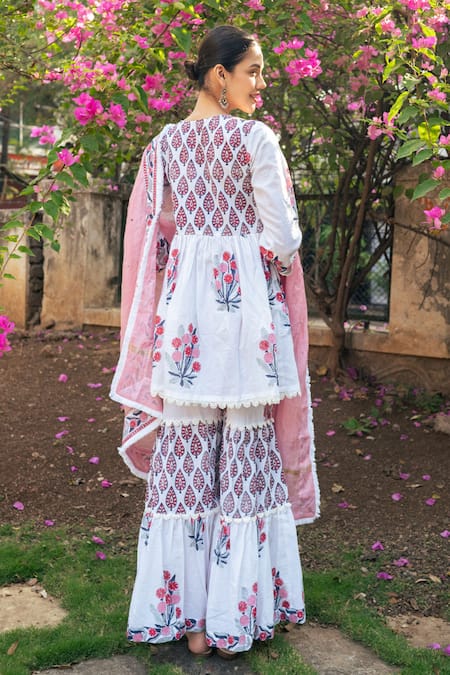 Ivory kurta featuring gather detailing and pink floral boota print. Paired with a tiered sharara and a lace detailed hem dupatta.