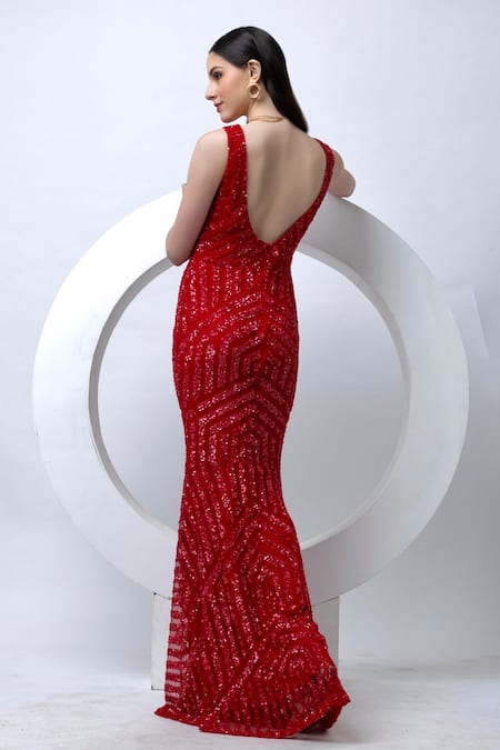 Red Net Hand Embroidered Sequins V Neck Body-con Gown