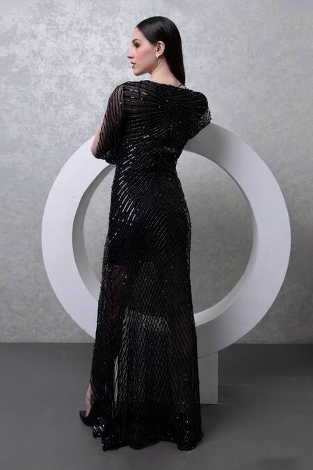 Black net gown featuring hand embroidered sequins and beads with a front slit