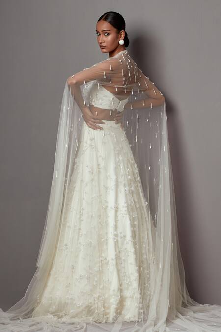 Ivory lehenga featuring embroidered 3-D bellflower motifs in jaal pattern, highlighted by pearls and crystals. Paired with a matching embroidered strapless blouse and embellished trail dupatta.