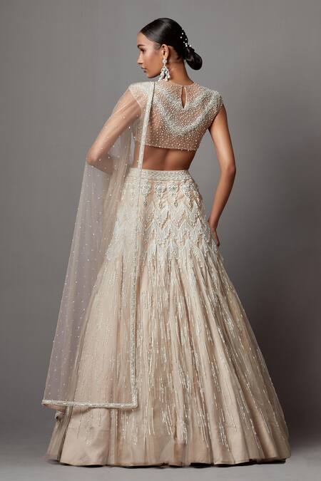 Buy_Mala And Kinnary_Beige Net Sequins, Crystals, Pearls Chevron Embellished Bridal Lehenga Set_Online_at_Aza_Fashions