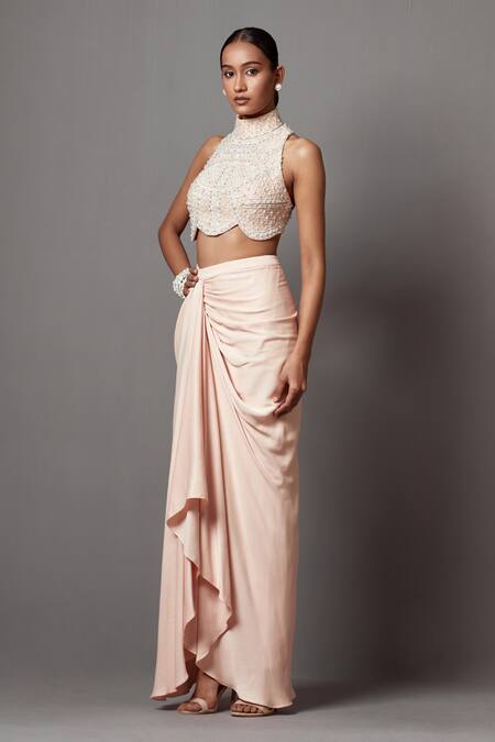 Pink blouse featuring embroidered floral jaal patterns with pearl, sequin, and crystal embellishments. Paired with a matching solid draped and pleated skirt.