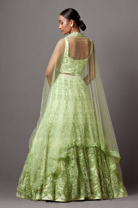 Green Net Embroidery, Pearls, Crystals Floral Swirl Baroque Bridal Lehenga Set