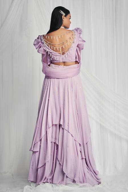 Lavender lehenga with crystal embellished detail & layered detail. Paired with embellished blouse with silk organza puff sleeves & pure organza scarf.