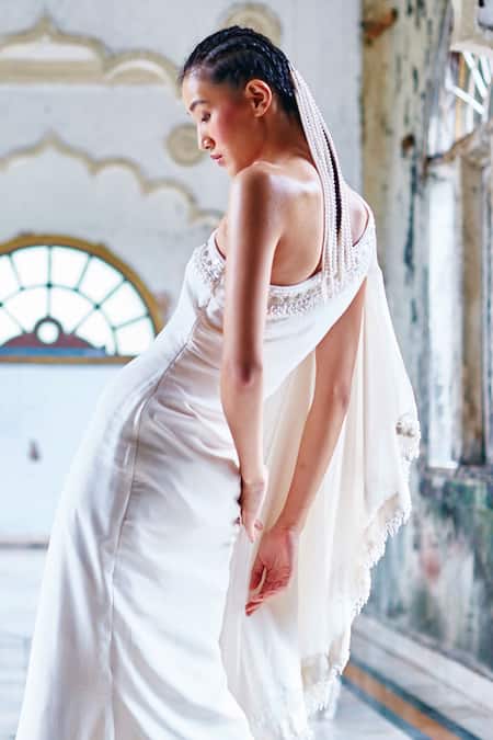 Ivory Georgette Beads, Sequins, Pearls One Shoulder Mantle Tunic And Pant Set