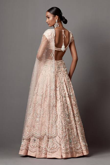 Pink Net Pearls, Sequins, Crystals, Embellished Victorian Bridal Lehenga Set
