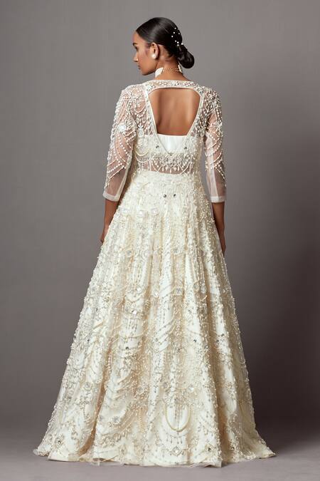 Ivory lehenga set featuring a scalloped pearl embroidered jacket with a sweetheart neckline and a matching sleeveless blouse. The ensemble is complemented by a flared lehenga with intricate embellishments of pearls, crystals, and sequins.