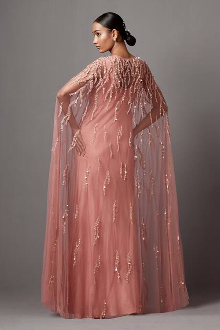 Dusty rose gown featuring embroidered wavy branch motifs embellished by sequins. Paired with a matching embellished sheer cape.