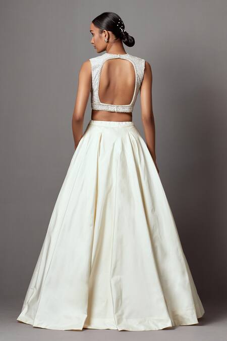 Ivory Taffeta Pearls, Sequins, Stones Embellished Blouse With Solid Lehenga