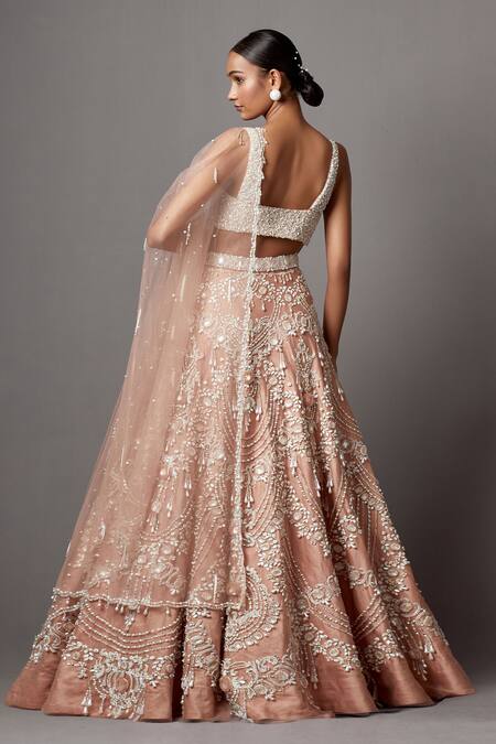 Pink Net Pearls, Crystals, Sequins Embellished Floral Scallop Bridal Lehenga Set