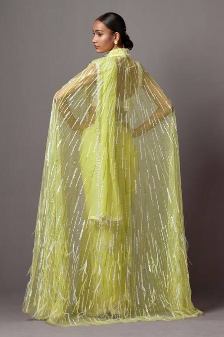 Lime sheer cape featuring embroidered stripe patterns highlighted by sequins, feathers, and crystals. Paired with a pearl embellished border saree and pearl cluster embroidered blouse.