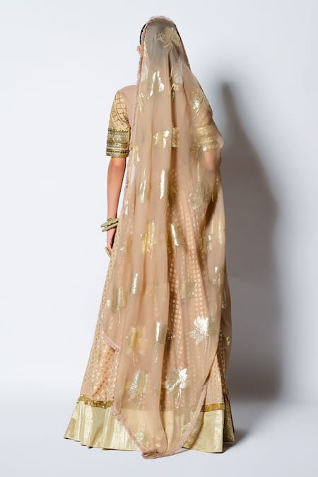 Gold Chanderi Silk Floral Motifs And Sequin V Neck Malang Bridal Lehenga Set