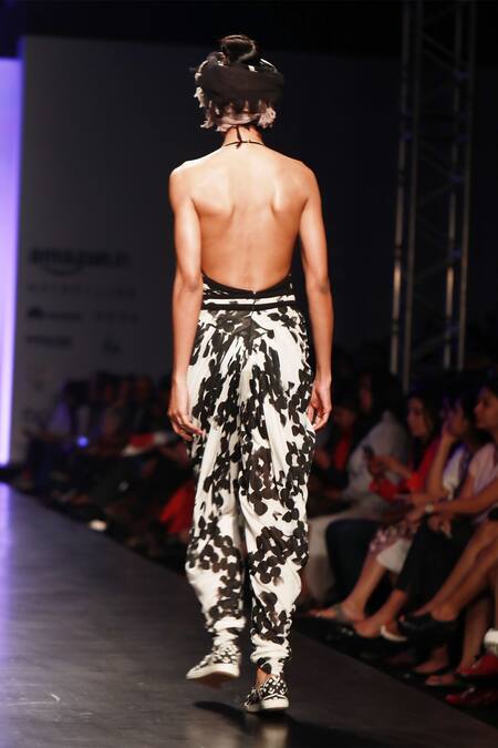 A black and white viscose jersey jumpsuit enhanced with rose print all over. It also features cutout panels.