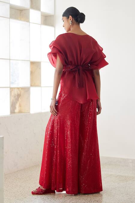 Red sheer padded pouf top in organza featuring overlapping detailing. Paired with a sequin packed pant and an embroidered tie-up belt.