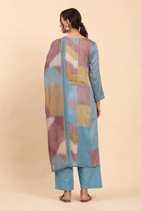 Blue kurta featuring abstract print and floral thread embroidery along the placket. Paired with a matching palazzo and dupatta.