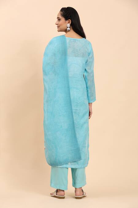 Light blue kurta featuring bird and floral print with thread work and lace detailing. Paired with a matching palazzo and a printed dupatta.