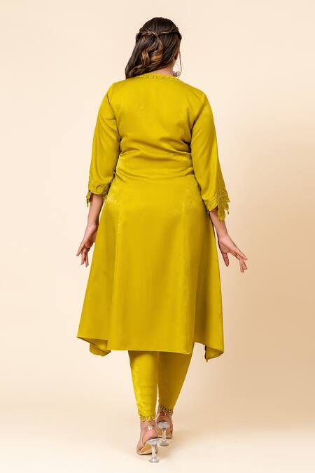 Dark lime green kurta featuring intricate embroidery and a front placket. Paired with tulip pants and a matching dupatta.